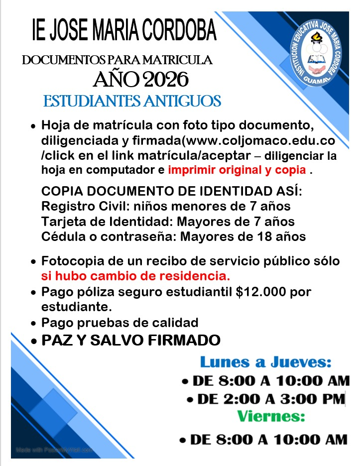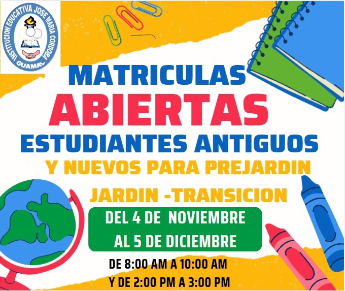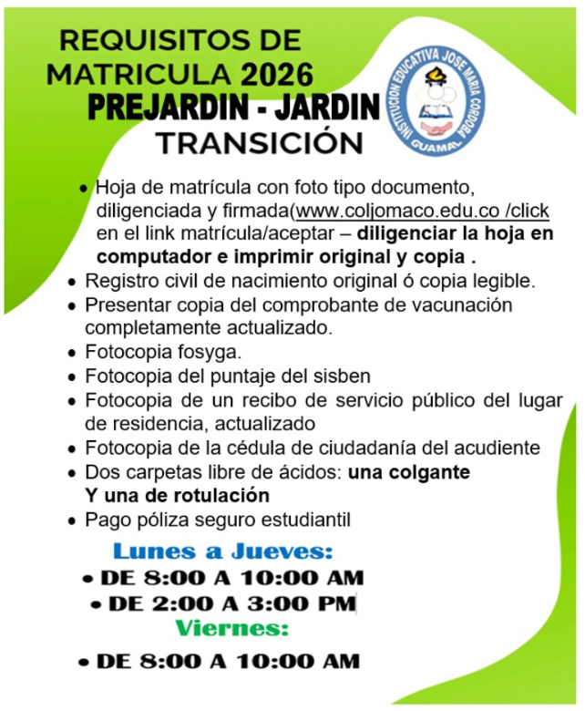 Se inicia el proceso de matriculas para la vigencia 2026, para estudiantes ANTIGUOS y estudiantes NUEVOS para los grados Prejardín, Jardín y Transición. En el horario de Lunes a Jueves: De 8:00 a.m. a 10:00 a.m. y de 2:00 p.m. a 3:00 p.m. y los Viernes de: 8:00 a.m. a 10:00 a.m. Descargue aquí la HOJA DE MATRICULA 2026. Cuando descargue su hoja de matricula, guárdela como Documento de Word 97 – 2003.