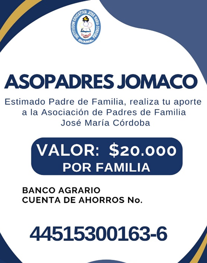 Se invita a todas las familias JOMACO a apoyar la Asociación de Padres de Familia, con este aporte voluntario. Dineros con los que la ASOPADRES hace acompañamiento en diferentes actividades programadas por la Institución.